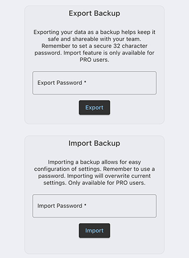 Export backups securely, with the added option to import which is available in the paid version. So one team member can configure and rest can use.